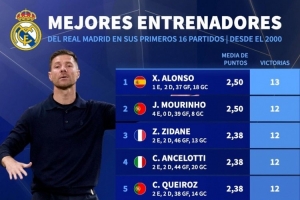 體育資訊10月10日訊 德國轉(zhuǎn)會(huì)市場(chǎng)統(tǒng)計(jì)了2000年以來皇馬主帥前16場(chǎng)比賽的勝利場(chǎng)次,并列出榜單,阿隆索13勝居首,穆里尼奧、齊達(dá)內(nèi)、安切洛蒂12勝。