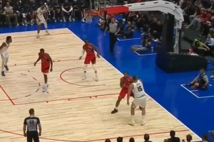 當(dāng)時(shí)約基奇被打,轉(zhuǎn)身之后底線一端單臂大掄傳將球送給另一端的卡梅隆-約翰遜,但后者三分沒能命中。