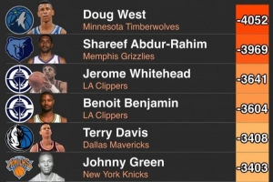 1、道格-韋斯特,累計凈勝分:-4052,出戰(zhàn)場次:676,場均凈勝分:-5.99。