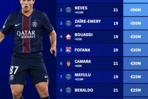 3、扎伊爾-埃梅里(19歲,巴黎圣日耳曼):5000萬(wàn)歐元