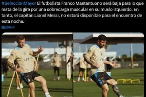 阿根廷官方寫道:“球員馬斯坦托諾的左大腿肌肉過度疲勞,將缺席接下來的巡回比賽。與此同時,隊長梅西也將缺席今晚的比賽?!?/p>