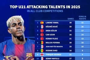 體育資訊10月11日訊 德國轉會市場列出了2025年五大聯(lián)賽U21球員參與進球榜,亞馬爾32球居首,杜埃26球次席。