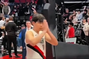 賽后,開拓者主場球迷們呼喊楊瀚森的名字予以支持,楊瀚森雙手合十表示感謝。