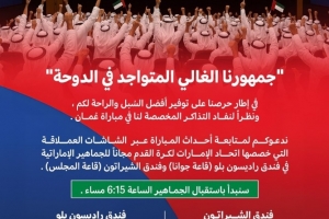 我們邀請您在阿聯(lián)酋足球協(xié)會為阿聯(lián)酋球迷免費(fèi)提供的位于麗笙酒店(喬安娜廳)和喜來登酒店(馬吉利斯廳)的巨型屏幕上關(guān)注比賽動態(tài)。我們將于18:15(22:15)開始接待公眾。”