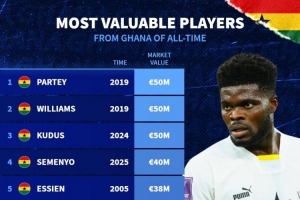 體育資訊10月13日訊 德國轉(zhuǎn)會(huì)市場列出加納球員歷史最高身價(jià)排名,托馬斯、伊納基-威廉姆斯、庫杜斯5000萬歐居首。