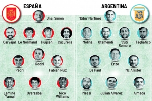阿根廷:大馬丁(8分);莫利納(7分)、羅梅羅(8分)、奧塔門迪(8分)、塔利亞菲科(7分);恩佐(8分)、德保羅(7分)、麥卡利斯特(8分);阿爾馬達(7分)、梅西(10分)、阿爾瓦雷斯(9分)
