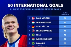 體育資訊10月13日訊 在上周對陣以色列的世預(yù)賽中,哈蘭德上演帽子戲法,這讓他成為歷史上第4快打入國家隊第50球的球員。作為對比,梅西用了107場才達到這一里程碑,而C羅則用了114場。德轉(zhuǎn)列出了達成國家隊50球所用場次最少的球員?。