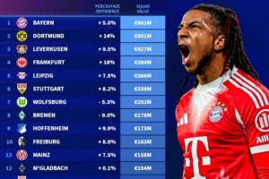 體育資訊10月15日訊 德轉(zhuǎn)更新了德甲身價,以下為更新后德甲各隊身價排名: