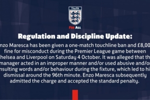 切爾西主教練馬雷斯卡因在10月4日周六對(duì)陣?yán)锲值挠⒊?lián)賽中存在不當(dāng)行為,被處以一場(chǎng)場(chǎng)邊禁賽及8000英鎊罰款。該指控指出馬雷斯卡在比賽第96分鐘被罰離場(chǎng)前,存在不當(dāng)行為或使用侮辱性、攻擊性言語(yǔ)。馬雷斯卡本人已承認(rèn)指控并接受標(biāo)準(zhǔn)處罰。