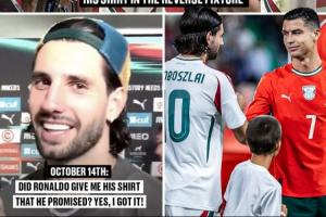 比賽結(jié)束后,索博斯洛伊接受采訪,被問(wèn)及C羅有沒(méi)有遵守諾言把球衣給他,索博斯洛伊開(kāi)心地回答道:“是的,我拿到了!”