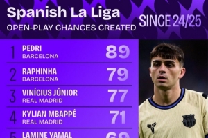 體育資訊10月16日訊 日前,Squawka統(tǒng)計了西甲運動戰(zhàn)創(chuàng)造機會次數(shù)排行,佩德里、拉菲尼亞前二,維尼修斯第三。