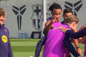 體育資訊10月16日訊 巴薩球員在訓(xùn)練時(shí)列隊(duì)歡迎德容和費(fèi)爾明,并對(duì)他們致以拍頭禮進(jìn)行祝賀。