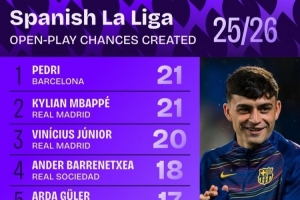 體育資訊10月16日訊 日前,Squawka統(tǒng)計了本賽季西甲運動戰(zhàn)創(chuàng)造機會排行,