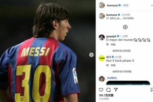 梅西發(fā)布了一張他身穿巴薩30號球衣的經(jīng)典舊照,并配文寫道:“已經(jīng)21年了……難以置信。”