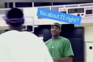 其中有一段畫面為詹姆斯和好友安東尼在訓(xùn)練館內(nèi)練球,談笑間安東尼質(zhì)疑起詹姆斯的年齡:“你其實有21歲吧?”