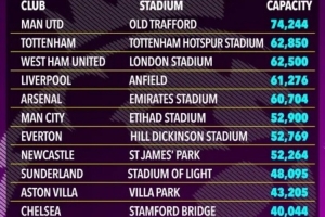 體育資訊10月17日訊 《太陽報》對比上個賽季和本賽季的英超手冊,發(fā)現(xiàn)有五支英超俱樂部的球場容量較上賽季有所變化。