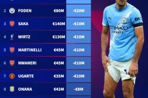 體育資訊10月17日訊 德轉(zhuǎn)更新英超身價(jià),其中跌的最多的是羅德里和福登,他們身價(jià)都下降了2000萬(wàn)歐。