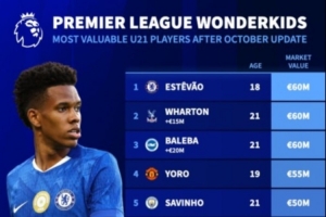 體育資訊10月18日訊 德轉(zhuǎn)在北京時(shí)間本月17日更新英超球員身價(jià),同時(shí)列出了英超U21球員身價(jià)榜,埃斯特旺、亞當(dāng)-沃頓、巴萊巴三人6000萬歐身價(jià)最高。