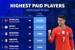 體育資訊10月18日訊 德國轉(zhuǎn)會市場統(tǒng)計了球員2025年的收入,并列出榜單,C羅2.39億歐居首,梅西1.11億歐次席。