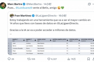 目前效力于貝蒂斯的巴爾特拉在社交媒體上轉發(fā)了這條動態(tài),配文調侃:“那么…蘇亞雷斯,來貝蒂斯吧,哥們。”