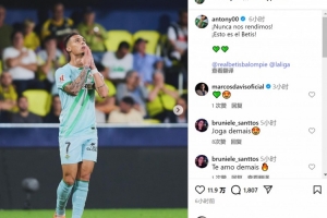 安東尼社媒曬出慶祝進(jìn)球的照片,配文:“我們永不言棄,這就是貝蒂斯!”