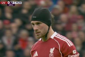 比賽剛開始姆伯莫破門,在進(jìn)球前的爭頂,范迪克爭頂中肘擊麥卡利斯特。之后麥卡接受治療,頭上戴上了帽子繼續(xù)比賽。