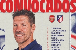 馬競(jìng)客戰(zhàn)阿森納名單:阿爾瓦雷斯、格列茲曼領(lǐng)銜,卡爾多索缺席