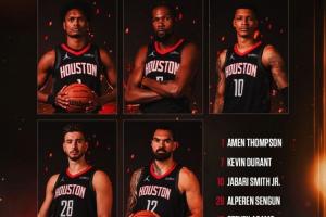 值得一提的是,這是一套“五大”陣容,五人身高分別為:阿門2米01、杜蘭特2米11、小史密斯2米11、申京2米11、亞當(dāng)斯2米11,首發(fā)平均身高為2米09。