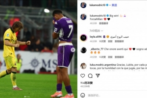 莫德里奇曬出了自己的賽場照,配文寫道:“偉大的勝利!Forza Milan。”