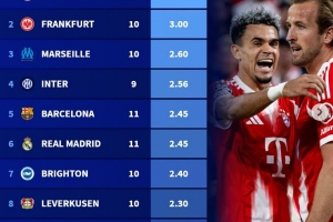 本賽季五大聯(lián)賽球隊(duì)場均進(jìn)球榜:拜仁3.64球居首,國米、皇薩在列