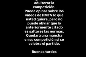 卡瓦哈爾:你好,特巴斯先生。違反規(guī)定就是玷污比賽。你可以對此前皇馬TV發(fā)布的視頻發(fā)表你想要說的任何意見。但你不能否認(rèn)之前所提到的內(nèi)容(海外賽)就是違反了規(guī)則。如果進(jìn)行海外賽,你的比賽就會有污點(diǎn)。
