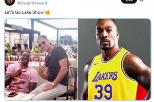 前湖人球員霍華德更新推特,他曬出了自己與佩林卡的合照,和自己身穿湖人39號(hào)的P圖,寫道:“湖人,加油!”