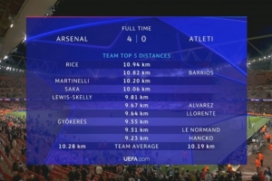 賽后兩隊(duì)跑動數(shù)據(jù)顯示,阿森納全隊(duì)平均跑動距離為10.28KM略高于馬競的10.19KM。但是,在跑動距離超過10KM的球員中,阿森納有3人,分別為賴斯(全場最高10.94KM)、馬丁內(nèi)利和薩卡,而馬競僅有1人為巴里奧斯。