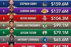 Boardroom列出本年度NBA球星收入排行(賽場(chǎng)收入+代言收入):,具體如下: