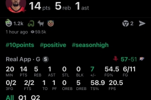 他上半場多次在打不開局面的情況下強(qiáng)行解決問題,20分鐘的時間里,投籃11中6,三分球2中0,罰球2中2,拿下全隊(duì)最高的14分外加5籃板1助攻的數(shù)據(jù),正負(fù)值+7。