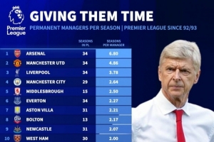 體育資訊10月22日訊 《轉(zhuǎn)會市場》統(tǒng)計了英超各隊的歷任正式主教練平均執(zhí)教年限情況,阿森納無懸念居首。