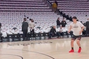 賽前,楊瀚森身穿中國(guó)紅戰(zhàn)靴進(jìn)行投籃熱身。