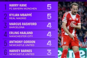 本賽季歐冠進球榜:凱恩姆巴佩5球列前二,哈蘭德拉師傅等人4球