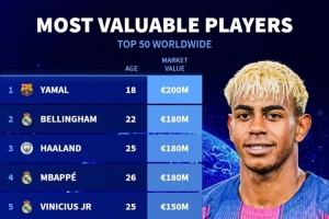 體育資訊10月25日訊 德國轉(zhuǎn)會(huì)市場(chǎng)列出了球員身價(jià)前50排名,亞馬爾2億歐居首,貝林厄姆、哈蘭德、姆巴佩1.8億歐次席。