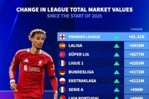 體育資訊10月25日訊 德國轉(zhuǎn)會(huì)市場統(tǒng)計(jì)了歐洲各聯(lián)賽2025年球員總身價(jià)的變化,并列出榜單,英超增加13.1億歐最多,西甲增加4.18億歐次席。