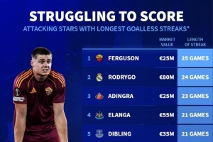 德轉(zhuǎn)盤(pán)點(diǎn)進(jìn)攻球員進(jìn)球荒(身價(jià)2500萬(wàn)歐+):