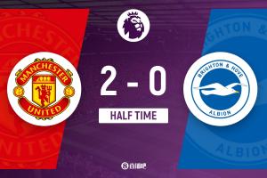上半場傷停補時1分鐘,半場結束,曼聯(lián)暫2-0布萊頓。
