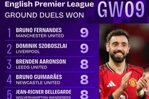 體育資訊10月28日訊 英超聯賽第9輪已經完賽,數據機構squawka統(tǒng)計了本輪地面對抗成功次數,曼聯隊長B費和利物浦中場索博斯洛伊并列居首。