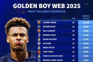 體育資訊10月29日訊 金童獎(jiǎng)在本月已經(jīng)公布了候選名單,《轉(zhuǎn)會(huì)市場(chǎng)》也統(tǒng)計(jì)了今年候選者的身價(jià)情況,亞馬爾無(wú)懸念居首。