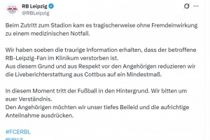 萊比錫俱樂部確認,一名萊比錫球迷進入球場時發(fā)生緊急醫(yī)療情況(與外部因素無關),被送往醫(yī)院,最終在醫(yī)院去世,萊比錫俱樂部社媒因此將這場比賽的直播報道減少到最低限度,并向家屬表示深切慰問。