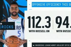 拉塞爾在場時(shí)獨(dú)行俠進(jìn)攻效率112.3,下場后為94.7;目前獨(dú)行俠進(jìn)攻效率103.8聯(lián)盟墊底
