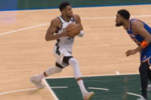 GIF-字母哥上籃,回放看明顯走步了吧!
