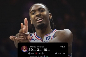 馬克西本場(chǎng)比賽出戰(zhàn)47分鐘,25投11中,三分9中3,罰球16中14砍下39分3籃板10助攻。