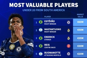 體育資訊10月30日訊 《轉(zhuǎn)會市場》統(tǒng)計了南美籍U20球員身價情況,切爾西新星埃斯特旺領(lǐng)跑。