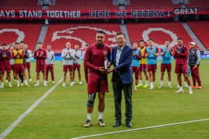 今天的官方訓(xùn)練開(kāi)始前,俱樂(lè)部為兩位球員舉行頒獎(jiǎng)儀式。俱樂(lè)部總經(jīng)理沙良昌為萊昂納多頒發(fā)第25輪最佳球員獎(jiǎng)杯,為李帥贈(zèng)送百場(chǎng)紀(jì)念球衣。